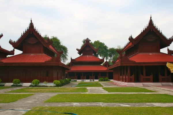 El complejo es una fortaleza cuadrada, con un lado de la muralla unos 2 km, el castillo está rodeado por un foso profundo y saltar por encima de la zanja por cuatro puentes, uno a cada lado del mundo. El palacio en sí en este momento está en obras de restauración permanente, ya que los principales edificios sufrieron graves daños durante la Segunda Guerra Mundial, el primer avión japonés, entonces los británicos. En el se encuentran las esquinas de los complejos de templos fortaleza.