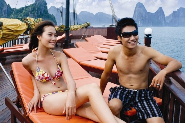 Después del almuerzo, navegamos hacia el interior del mágico paisaje de la isla Dinh Huong, Ga Choi, Isla Perro, montaña Binh Phong, CuevaSung Sot, relajarse en la playa Titop. Disfrute del atardecer en la cima de la montaña Titop o tomar un bote de remos de bambú para descubrir un túnel de agua con muchos arrecifes de coral en una laguna escénica. De vuelta a bordo, disfrutar de una cena en el barco.