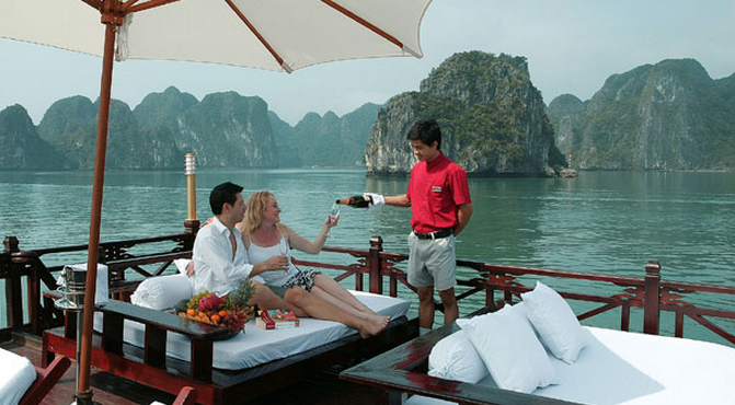 11.30: Nuestro equipo del barco le dará la bienvenida al bordo con bebidas frescas,acontinuacion check in en su cabina y recibirá la información del barco, el almuerzo se le preparara con mariscos frescos en barco mientras exploraran el crucero por la bahía para ver las impresionante karst de las formaciones diferentes: León, Tea Pot, islotes Sapo ........... y luego pararse a visitar la cueva Sung Sot o Cueva Sorpresa - la cueava más grande de la Bahia Halong. Más tarde, usted tendrá un montón de tiempo para nadar y tomar el sol. Usted también tendrá la oportunidad de disfrutar de una maravillosa puesta de sol vista desde su barco. Después de la cena, se le retira a la comodidad en su cabina.