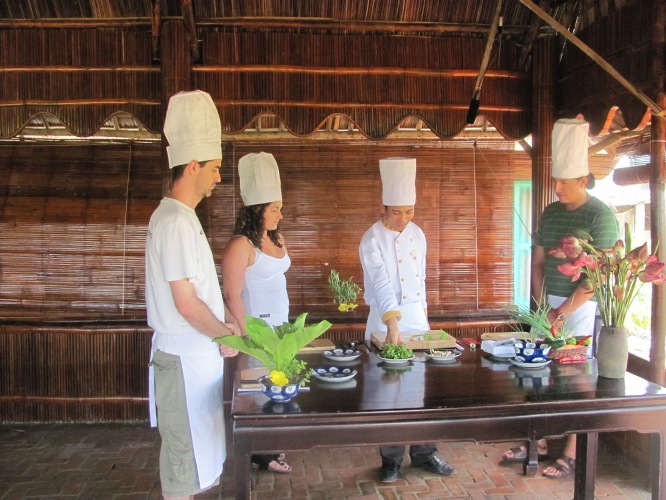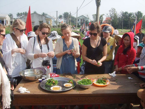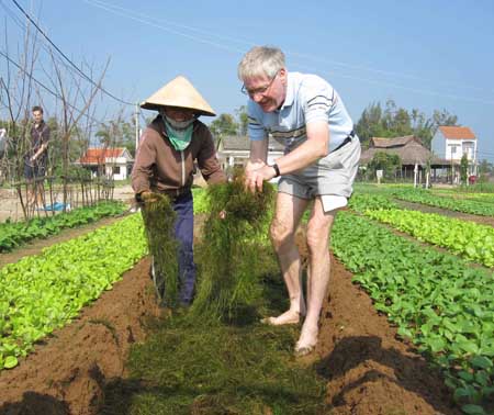 Un corto paseo le llevará por todo el huerto y entonces usted puede unirse con los agricultores en la preparación de la tierra y la fertilización con algas del lago local. Siguientes pasos están rastrillando el suelo, siembra, riego, recogiendo verduras y muchas otras actividades de jardinería. Después de todas estas actividades, usted tomará un breve descanso y disfrutar de baño de pies antes de llegar a preparar el almuerzo con una familia local. El almuerzo consistirá en muchas especialidades locales, incluyendo roll primavera 'Tam Huu', Banh Xeo o panqueque de personas en la región central de Vietnam. Usted puede participarse en la clase de cocina con el chef vietnamita para preparar esas comidas vietnamitas. Después de que sus excursiones por la mañana y el almuerzo, se llevará a vietnamita siesta post-pradial tradicional antes de aprender a cosechar y envolver las verduras.